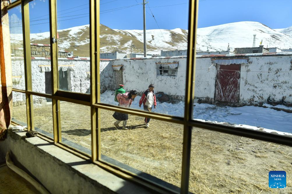 Sichod Drolma (L) arrives at home in Damxung County, southwest China's Xizang Autonomous Region, Nov. 15, 2023.