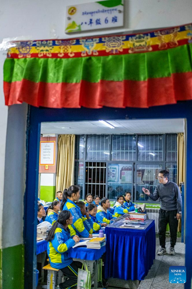 Sichod Drolma has a Tibetan language class at Damxung County Middle School in Damxung County, southwest China's Xizang Autonomous Region, Nov. 10, 2023.