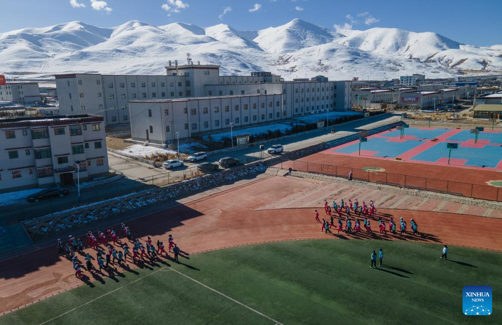 This aerial photo taken on Nov. 10, 2023 shows students doing exercise at Damxung County Middle School in Damxung County, southwest China's Xizang Autonomous Region.