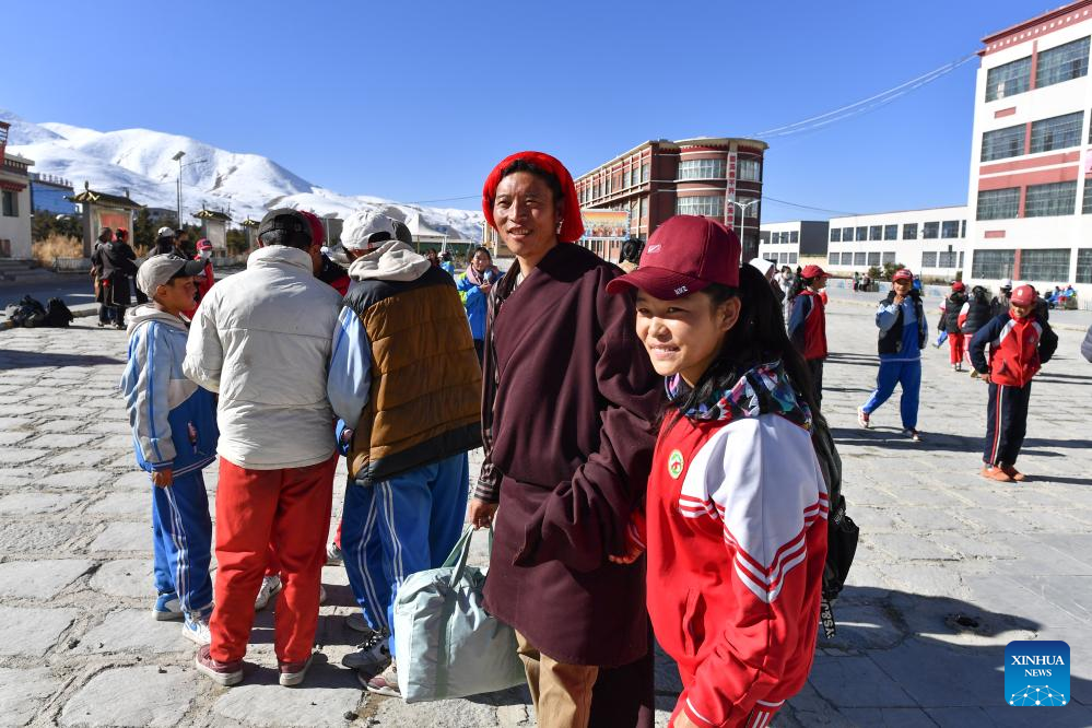 Sichod Drolma's father comes to school to pick her home in Damxung County, southwest China's Xizang Autonomous Region, Nov. 15, 2023.