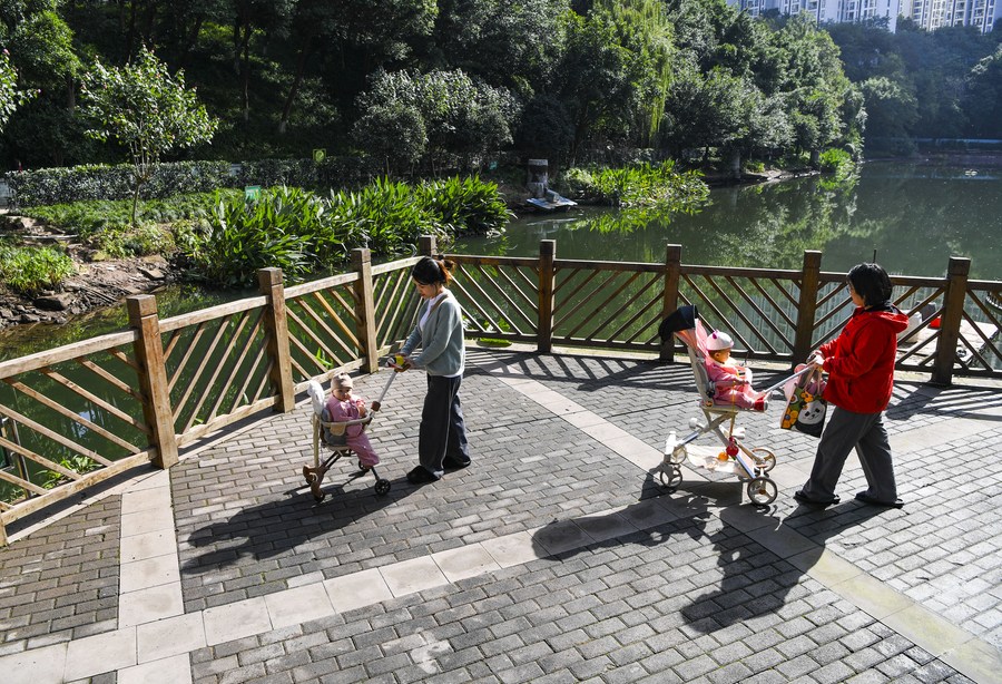 People walk along the Panxi River in Yubei District of southwest China's Chongqing Municipality, Nov. 16, 2023. (Xinhua/Wang Quanchao)