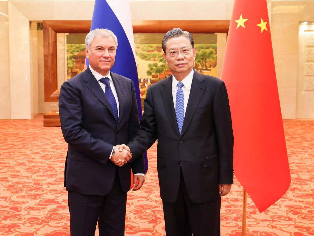 Zhao, chairman of the National People's Congress (NPC) Standing Committee, said that under the strategic guidance of the two countries' top leaders, the China-Russia comprehensive strategic partnership of coordination for the new era has maintained the correct progressive direction. Political mutual trust has been continuously consolidated, practical cooperation has been carried out vigorously and people-to-people and sub-national exchanges have been continuously deepened, setting an example of new model of major-country relations.