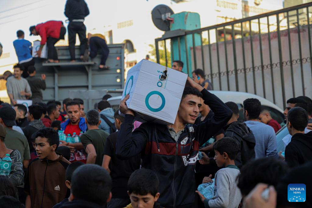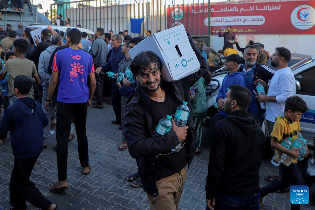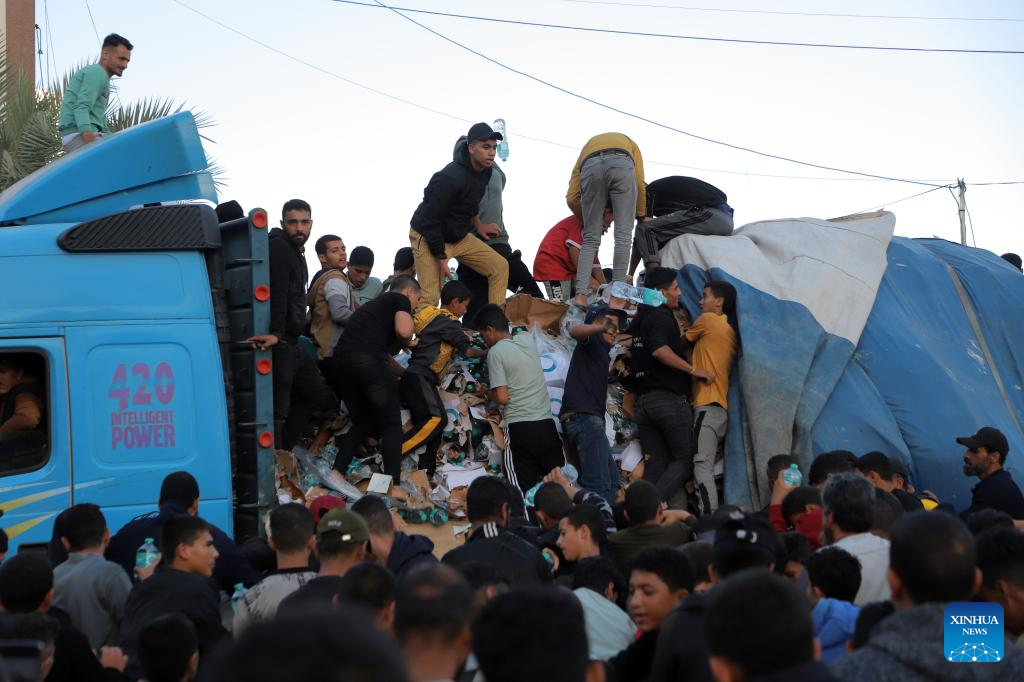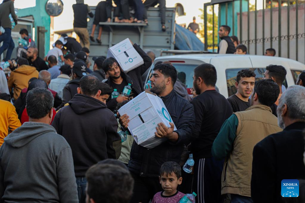 Palestinian people get drinking water from trucks loaded with food supplies in the southern Gaza Strip city of Khan Younis, on Nov. 21, 2023. The Palestinian death toll in the Gaza Strip has surpassed 14,000 since the current Israel-Hamas conflict broke out on Oct. 7, the Hamas-run government media office said Tuesday. (Photo by Rizek Abdeljawad/Xinhua)