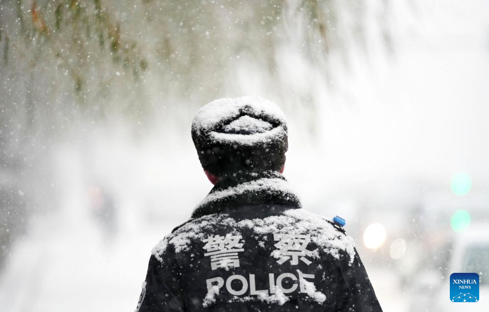 A police officer is seen on duty in the snow in Harbin, capital of northeast China's Heilongjiang Province, Nov. 22, 2023. (Xinhua/Wang Jianwei)