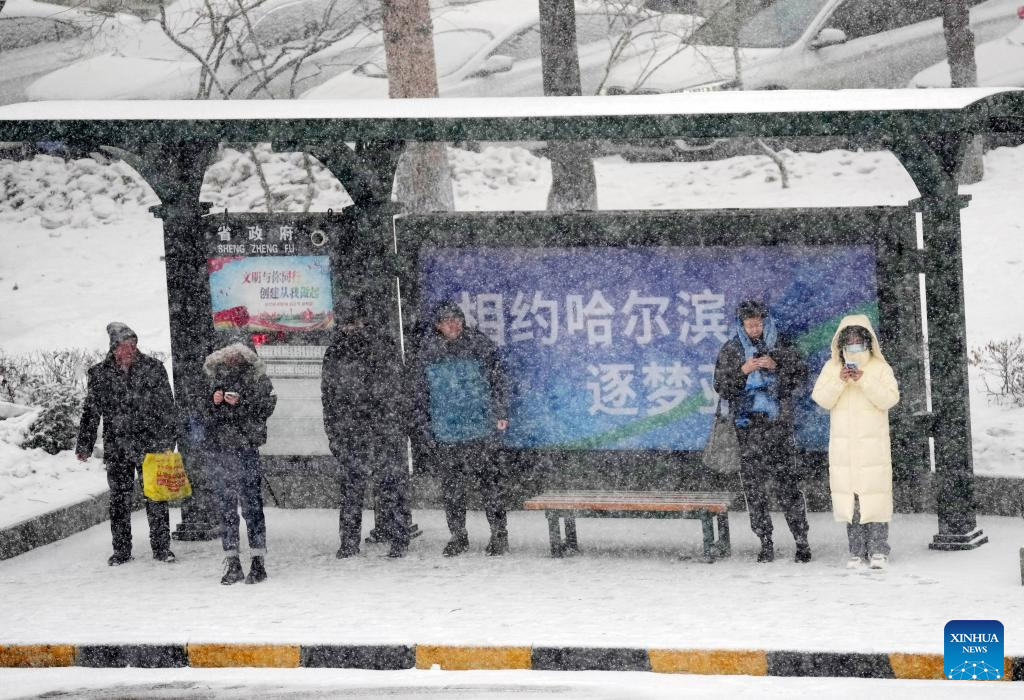People wait for buses in the snow in Harbin, capital of northeast China's Heilongjiang Province, Nov. 22, 2023. (Xinhua/Wang Jianwei)
