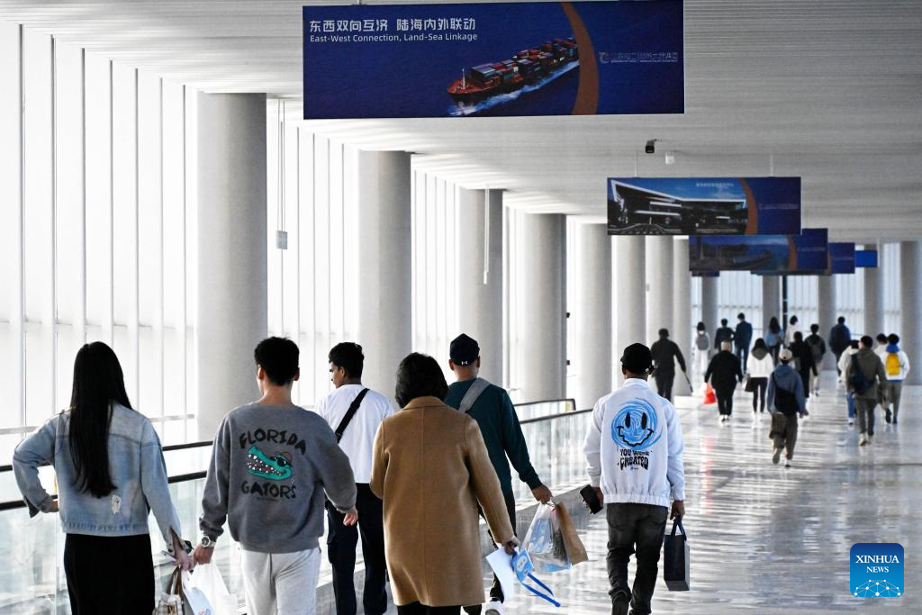People visit the passenger transportation center of Qingdao Cruise Terminal in Qingdao, east China's Shandong Province, Nov. 21, 2023. Qingdao has been vigorously developing its cruise tourism service. As cruise voyages become increasingly frequent along with a climbing number of inbound tourists, they also contribute to the sustainable development of related sectors in the city. To date, Qingdao is connected by 40 international cruise lines to nearly 20 port cities. (Xinhua/Li Ziheng)