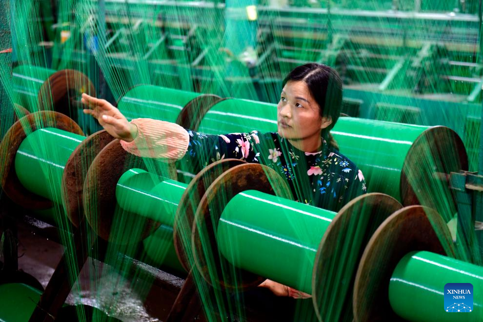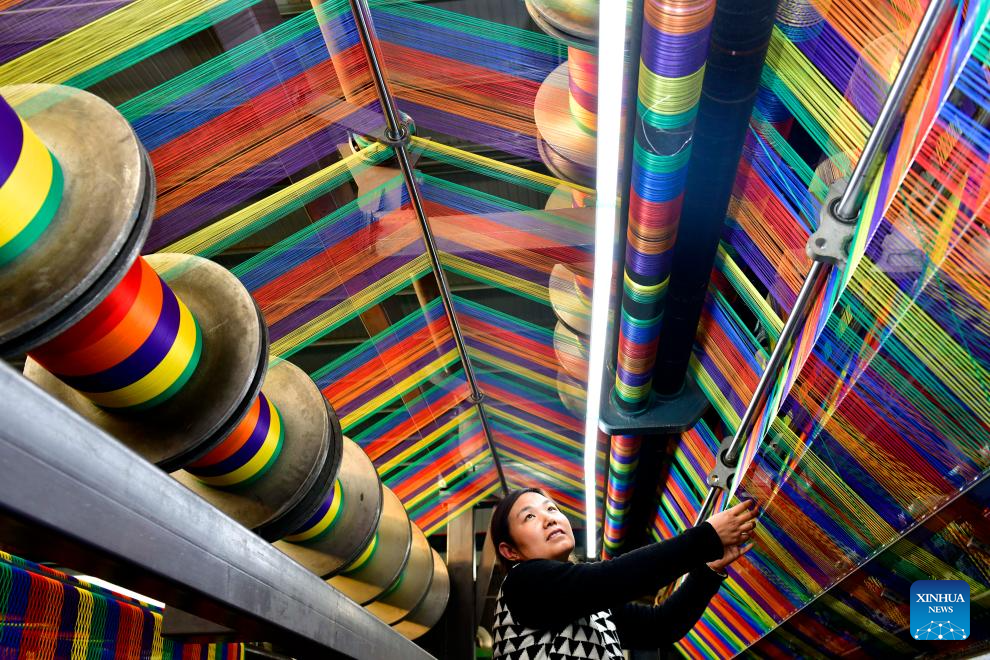 A worker arranges reels of thread at a workshop of an enterprise in Lizhuang Town of Huimin County, east China's Shandong Province, Nov. 22, 2023. Huimin has more than 1,300 enterprises producing net and rope products, which are widely used in construction, sports and other industries. From January to October this year, this industry in Huimin has achieved an output value of over 21.7 billion yuan (about 3.03 billion U.S. dollars). (Xinhua/Guo Xulei)