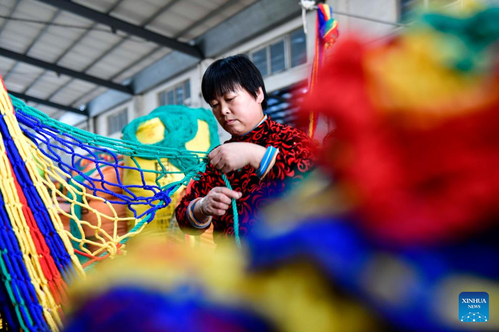 A woman works at a workshop of an enterprise in Jianglou Town of Huimin County, east China's Shandong Province, Nov. 22, 2023. Huimin has more than 1,300 enterprises producing net and rope products, which are widely used in construction, sports and other industries. From January to October this year, this industry in Huimin has achieved an output value of over 21.7 billion yuan (about 3.03 billion U.S. dollars). (Xinhua/Guo Xulei)