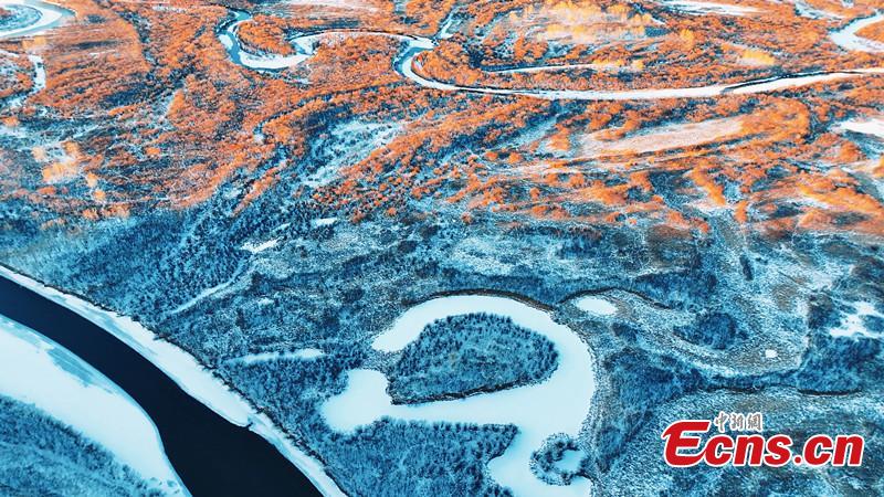 Snow flowing in winding river forms a white belt at Erguna wetland in north China's Inner Mongolia Autonomous Region. (Photo: China News Service/Wang Zhuo)