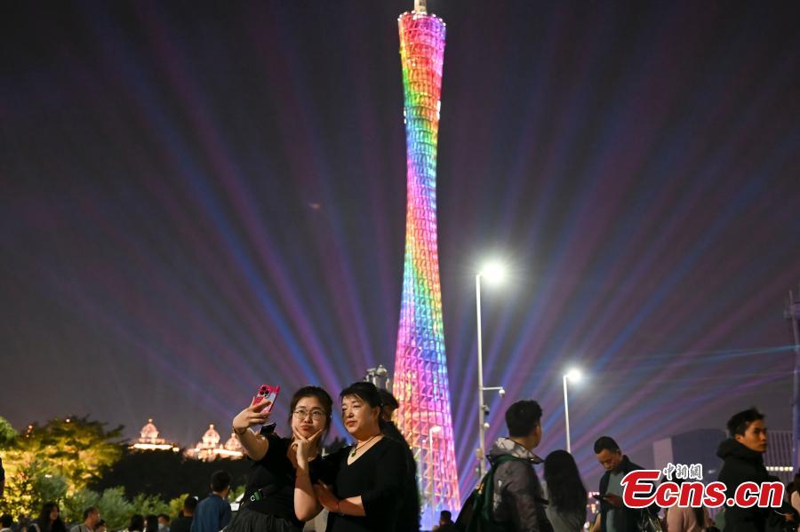 The Canton Tower is illuminated during the 12th Guangzhou international light festival in south China's Guangdong Province, Nov. 21, 2023. (Photo: China News Service/Chen Jimin)
