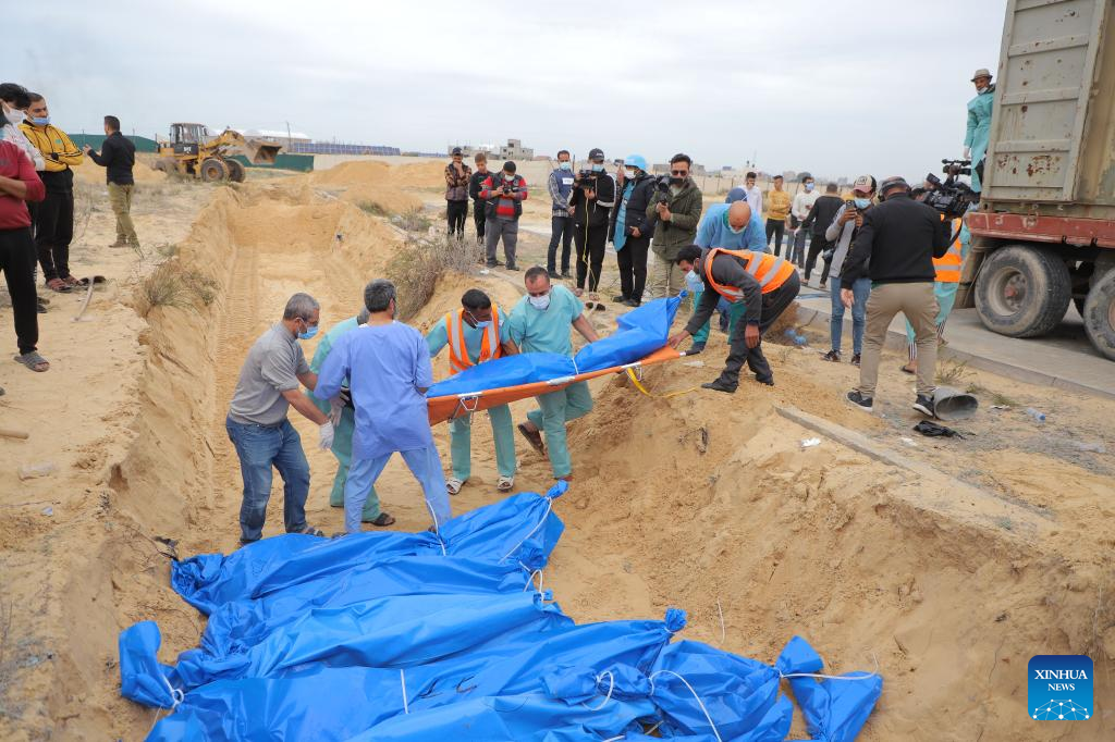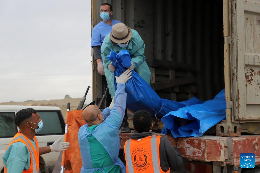 Palestinian workers transfer a body as they establish a mass grave for the victims inside and north of Gaza City, in the southern Gaza Strip city of Khan Younis, on Nov. 22, 2023. The Palestinian death toll in the Gaza Strip has risen to 14,532 since the outbreak of the Hamas-Israel conflict on Oct. 7, the Hamas-run government media office said Wednesday. (Photo by Rizek Abdeljawad/Xinhua)