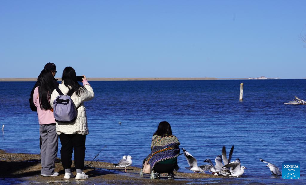Tourists visit Qinghai Lake in northwest China's Qinghai Province, Nov. 23, 2023. (Xinhua/Geng Huihuang)?