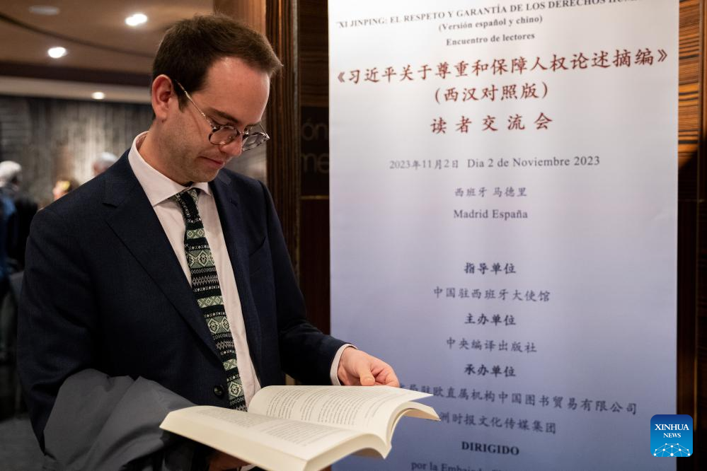 A man reads a book of Spanish-Chinese version of "Xi Jinping on Respecting and Protecting Human Rights" in Madrid, Spain, Nov. 22, 2023. The launch ceremony of the Spanish-Chinese version of the book was held here on Wednesday, together with a seminar on "Human Wisdom for Global Governance." (Xinhua/Meng Dingbo)