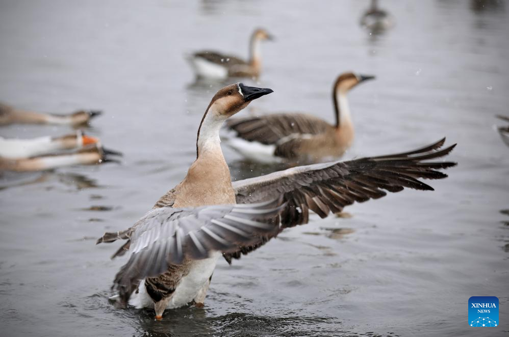 This photo taken on Nov. 23, 2023 shows migratory birds swimming in the Hunhe River in Shenyang, northeast China's Liaoning Province. (Xinhua/Yao Jianfeng)