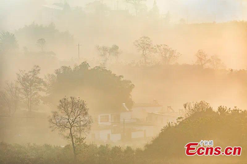 Houses and colorful trees hidden in early winter mist create an atmospheric scene in Yuexi County of Anqing City, east China's Anhui Province. (Photo: China News Service/Jiang Kejian)