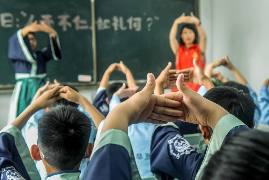 Students learn to make traditional Chinese salute at a Confucian lecture hall in Qufu City, east China's Shandong Province, June 12, 2023. (Photo by Cao Junbo/Xinhua)