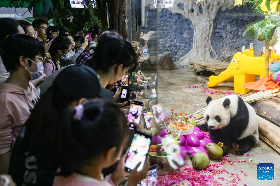 Visitors watch giant panda Gonggong taking food at the Hainan Tropical Wildlife Park and Botanical Garden in Haikou, south China's Hainan Province, Nov. 25, 2023. Giant pandas Gonggong and Shunshun have lived in Hainan for five years since they made their public debut at the Hainan Tropical Wildlife Park and Botanical Garden in 2018. A celebration ceremony was held here on Saturday, attracting lots of visitors. (Xinhua/Zhang Liyun)