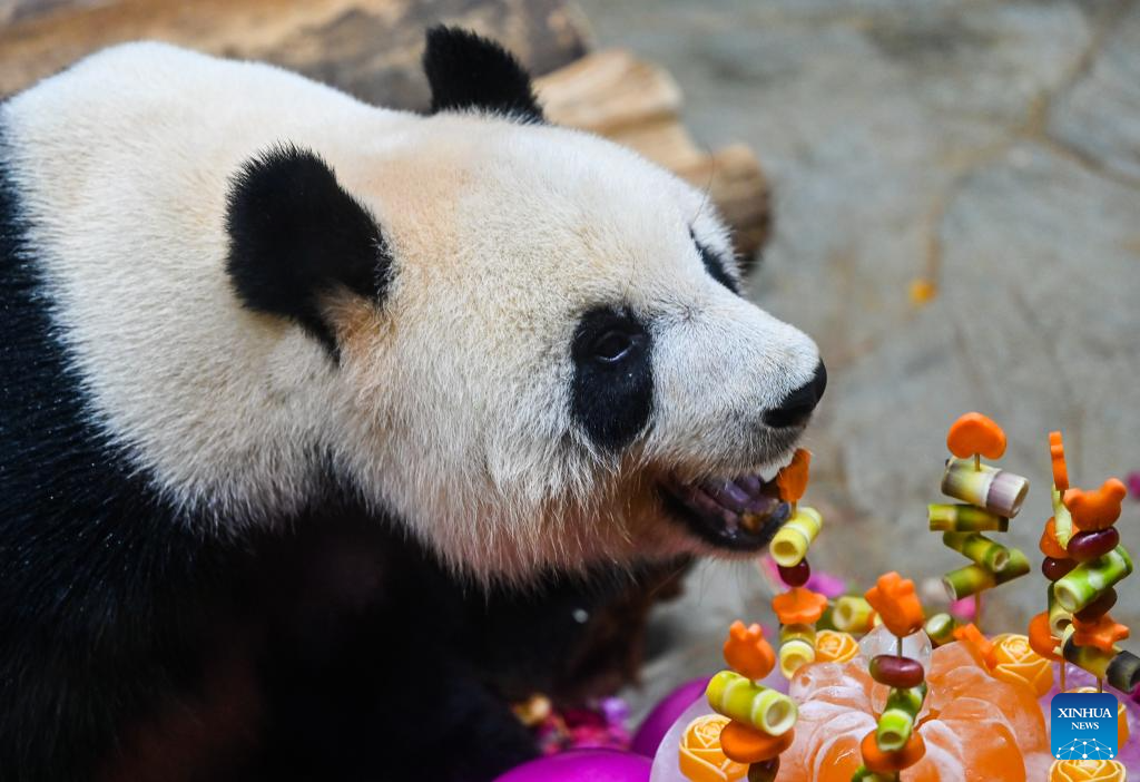 Giant panda Gonggong takes food at the Hainan Tropical Wildlife Park and Botanical Garden in Haikou, south China's Hainan Province, Nov. 25, 2023. Giant pandas Gonggong and Shunshun have lived in Hainan for five years since they made their public debut at the Hainan Tropical Wildlife Park and Botanical Garden in 2018. A celebration ceremony was held here on Saturday, attracting lots of visitors. (Xinhua/Fan Yuqing)