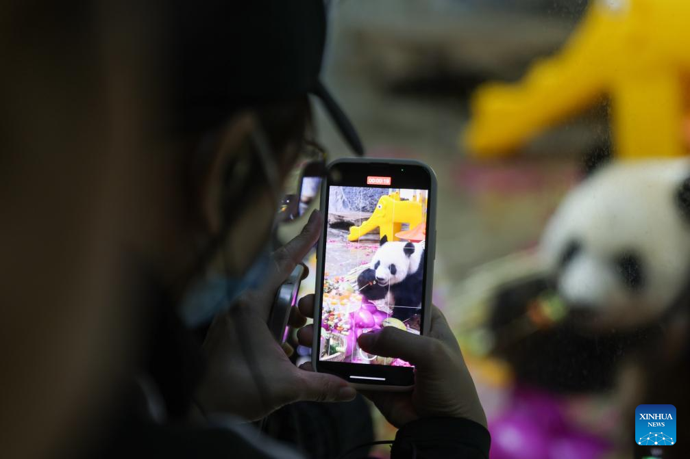 A visitor takes photos of giant panda Gonggong at the Hainan Tropical Wildlife Park and Botanical Garden in Haikou, south China's Hainan Province, Nov. 25, 2023. Giant pandas Gonggong and Shunshun have lived in Hainan for five years since they made their public debut at the Hainan Tropical Wildlife Park and Botanical Garden in 2018. A celebration ceremony was held here on Saturday, attracting lots of visitors. (Xinhua/Fan Yuqing)