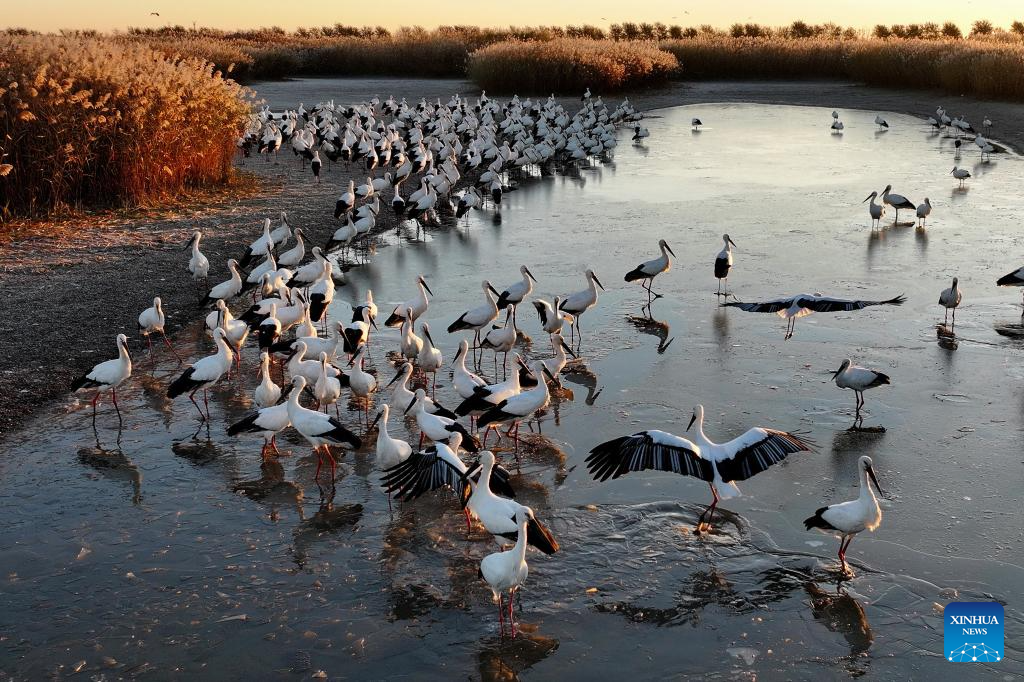 This aerial photo taken on Nov. 25, 2023 shows a flock of oriental white storks foraging at a wetland in Tangshan, north China's Hebei Province. Coastal wetlands in the city of Tangshan are important habitats for migratory birds. (Xinhua/Yang Shiyao)