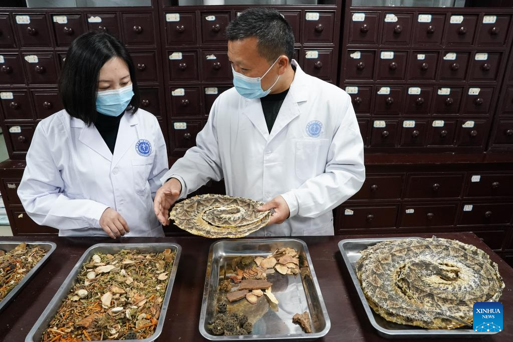 Ni Yongsong (R), head of Qimen Institute of Snakebite, and a staff member talk about medicinal materials for treating snakebite at the institute in Qimen County of Huangshan City, east China's Anhui Province, Nov. 8, 2023. (Xinhua/Du Yu)