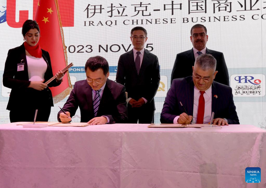 This photo taken on Nov. 25, 2023 shows the signing ceremony of the establishment of the Iraqi-Chinese Business Council in Baghdad, Iraq. Iraq and China announced in Baghdad Saturday the establishment of the Iraqi-Chinese Business Council to enhance trade and investment between Iraqi and Chinese companies.(Xinhua/Khalil Dawood)