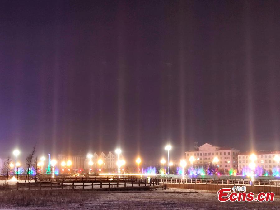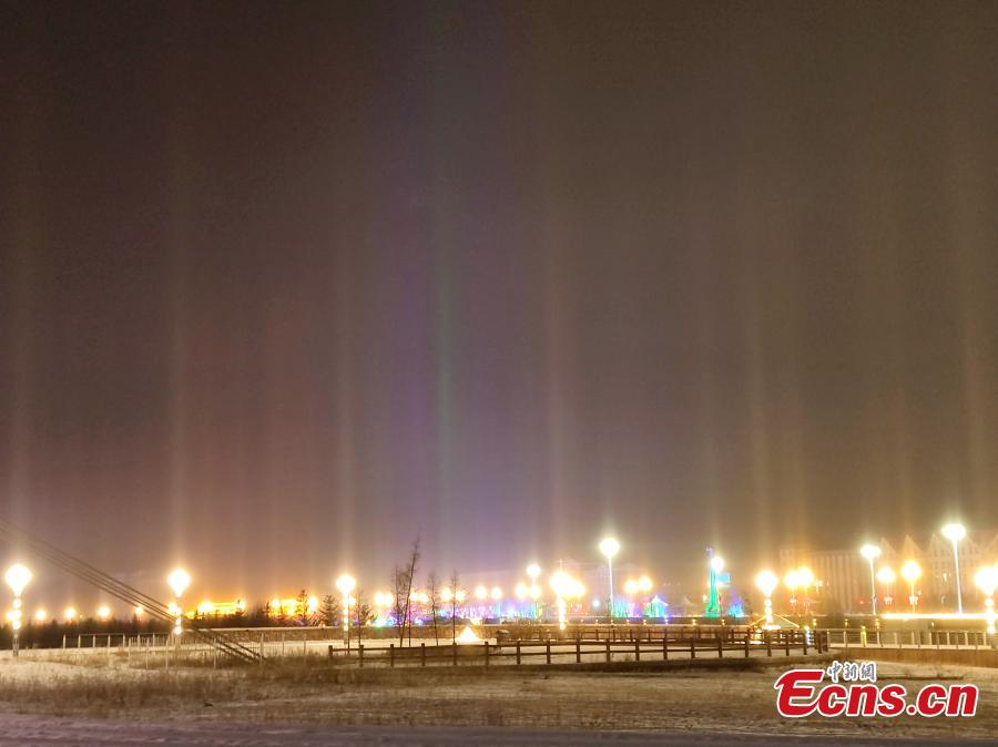Stunning light pillars illuminate the night sky of Genhe City, known as China's Pole of Cold, in north China's Inner Mongolia Autonomous Region, Nov. 25, 2023. (Photo: China News Service/Liu Liping)