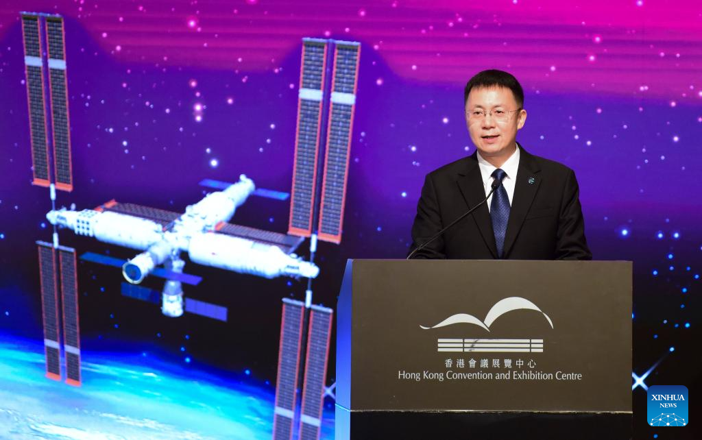 Lin Xiqiang, deputy director of the China Manned Space Agency (CMSA), delivers a speech during a press conference in Hong Kong, south China, Nov. 28, 2023. A delegation of China's manned space program is on a six-day visit to Hong Kong and Macao from Tuesday to Sunday at the invitation of the Hong Kong Special Administrative Region (HKSAR) government and the Macao SAR government, according to the CMSA. (Xinhua/Lui Sui Wai)