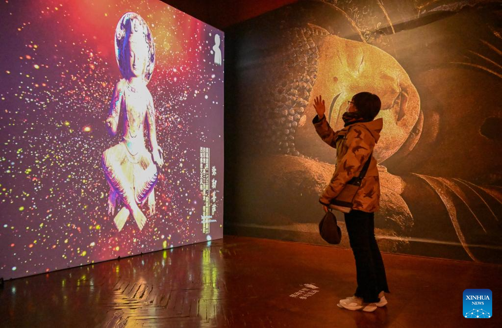 A visitor views a digital exhibit at an exhibition themed on Dunhuang culture at the Tianjin Digital Art Museum in Tianjin, north China, Nov. 28, 2023. The exhibition will last until March 2024. (Xinhua/Sun Fanyue)
