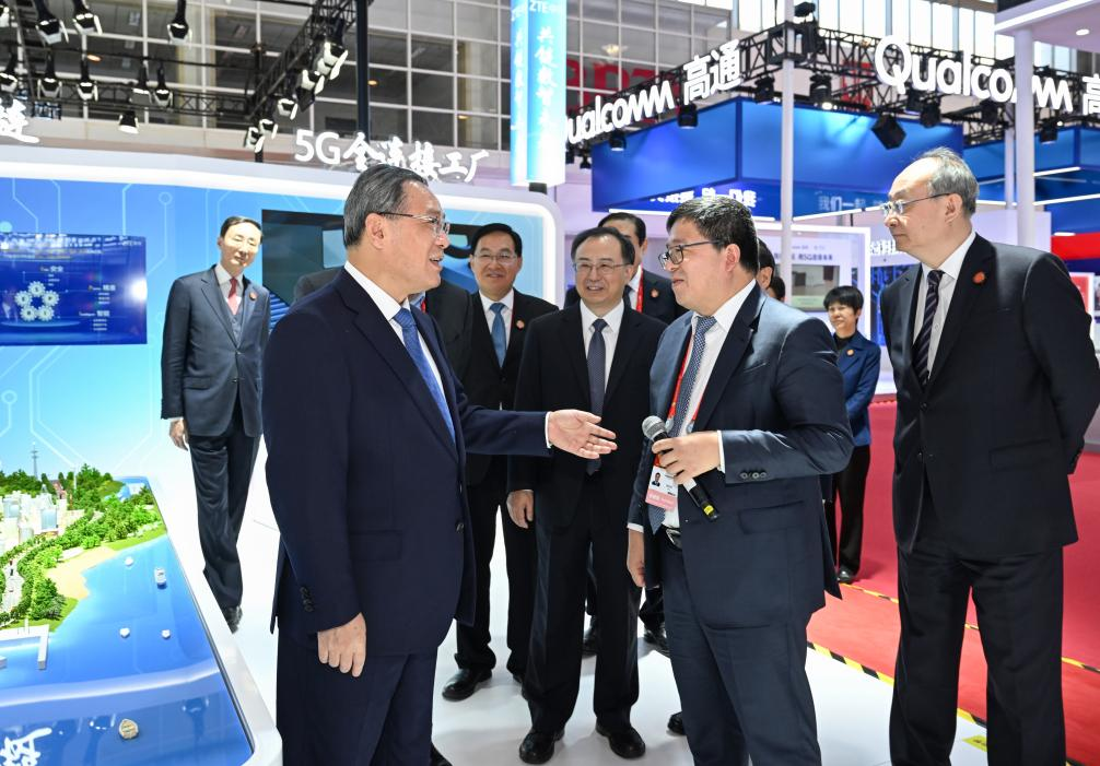 Chinese Premier Li Qiang talks with a staff member of an exhibitor at the exhibition hall before the opening ceremony of the first China International Supply Chain Expo in Beijing, capital of China, Nov. 28, 2023. Li attended the opening ceremony of the first China International Supply Chain Expo and the Global Supply Chain Innovation and Development Forum, and delivered a keynote speech in Beijing on Tuesday. (Xinhua/Rao Aimin)