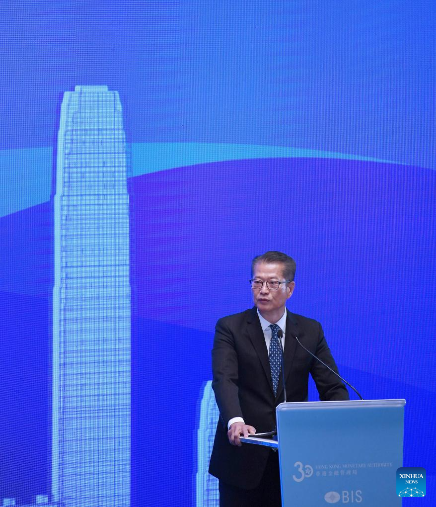 Paul Chan, financial secretary of the Hong Kong Special Administrative Region (HKSAR) government, delivers a speech at a high-level conference co-organized by the Hong Kong Monetary Authority (HKMA) and the Bank for International Settlements (BIS) in Hong Kong, south China, Nov. 28, 2023. (Xinhua/Chen Duo)
