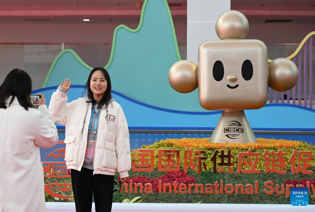 A visitor poses for photo near a mascot of the China International Supply Chain Expo (CISCE) at the expo in Beijing, capital of China, Nov. 29, 2023. The CISCE opened in Beijing, the first of its kind in the world devoted to promoting industrial and supply chain collaboration. (Xinhua/Li He)