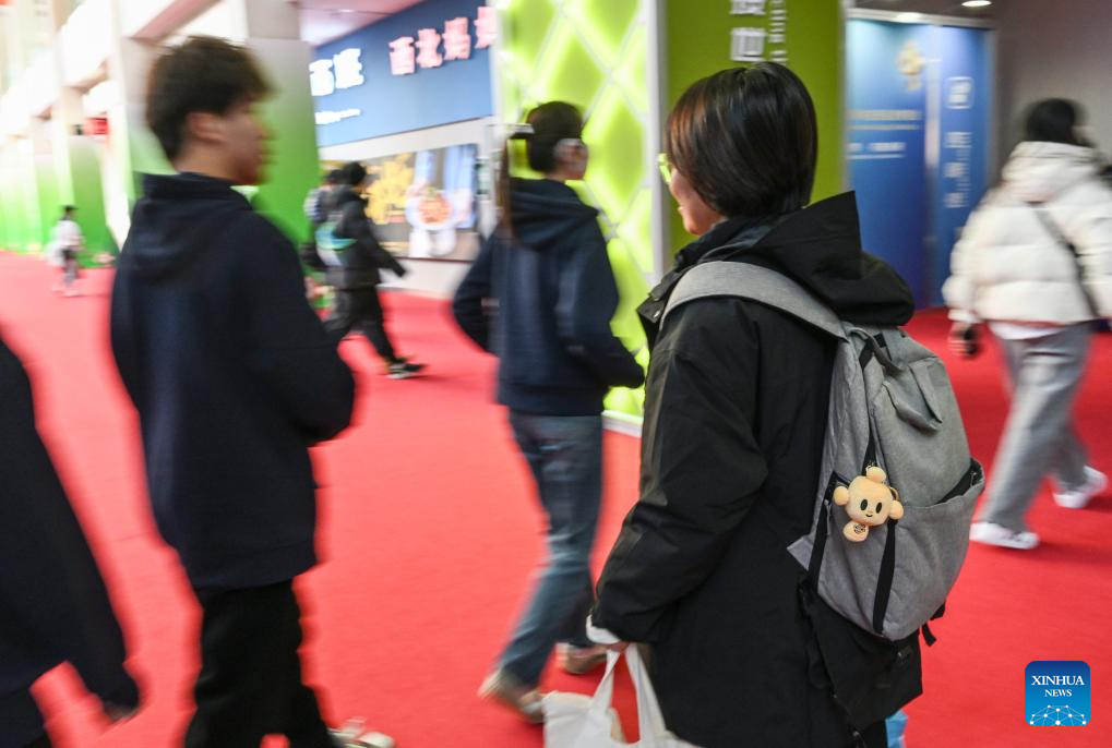 A visitor views mascot products of the China International Supply Chain Expo (CISCE) held in Beijing, capital of China, Nov. 29, 2023. The CISCE opened in Beijing, the first of its kind in the world devoted to promoting industrial and supply chain collaboration. (Xinhua/Ren Chao)