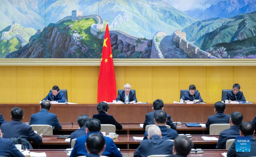 Zhang Guoqing, Chinese vice premier and head of the Work Safety Committee of the State Council, delivers a speech at a national meeting on workplace safety in Beijing, capital of China, Nov. 29, 2023. The meeting was chaired by Wang Xiaohong, state councilor and deputy head of the committee. (Xinhua/Zhai Jianlan)