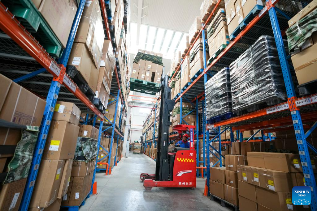 A worker works in a warehouse of a leading motorcycle wheel hub manufacturing enterprise in Dianjiang County of Chongqing, southwest China, Nov. 28, 2023. Chongqing is one of the important production and export bases of motorcycle parts in China. In recent years, Dianjiang County of Chongqing has guided local leading motorcycle wheel hub production enterprises to rely on scientific and technological innovations to promote industrial upgrading. (Xinhua/Liu Chan)