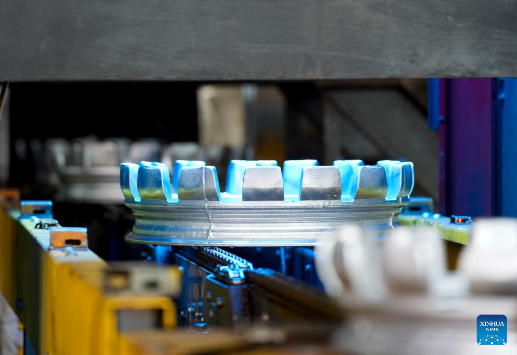 A primary wheel hub product undergoes quality inspection at an automatic hub production line of a leading motorcycle wheel hub manufacturing enterprise in Dianjiang County of Chongqing, southwest China, Nov. 28, 2023. Chongqing is one of the important production and export bases of motorcycle parts in China. In recent years, Dianjiang County of Chongqing has guided local leading motorcycle wheel hub production enterprises to rely on scientific and technological innovations to promote industrial upgrading. (Xinhua/Liu Chan)