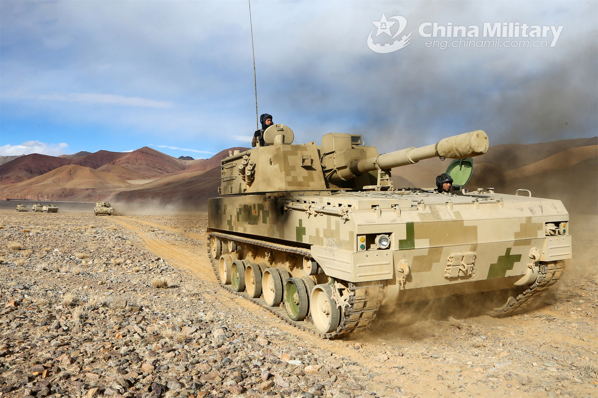 Armored vehicles attached to an artillery element with a brigade under the PLA 76th Group Army kick up plumes of dust en route to a designated area during a tactical training exercise in early November, 2023. (eng.chinamil.com.cn/Photo by Chen Shanfeng)