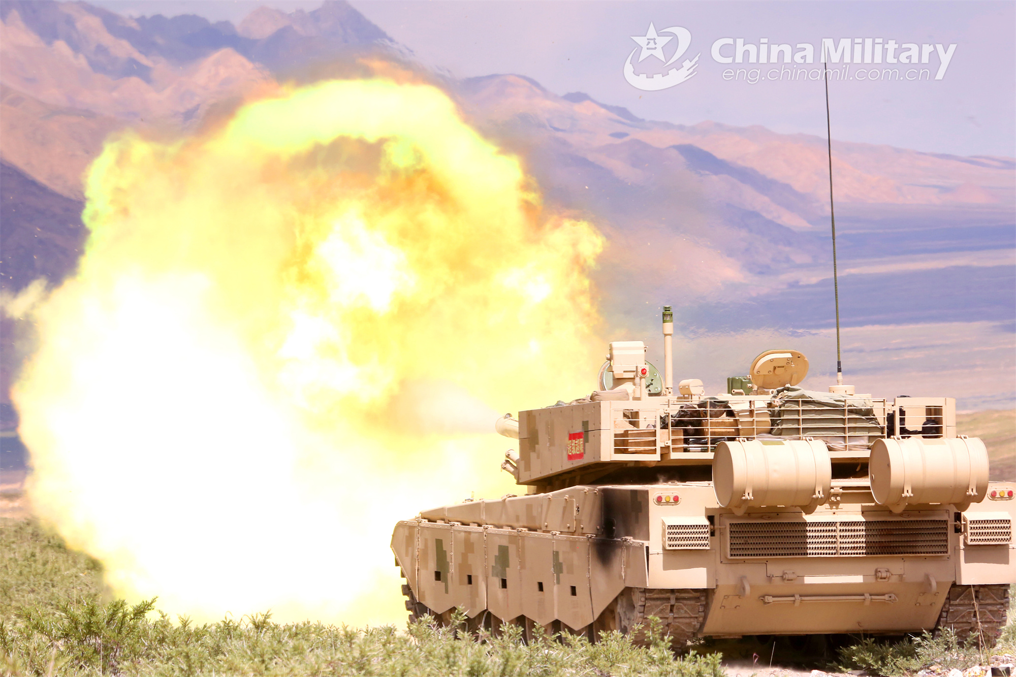 A main battle tank attached to an artillery element with a brigade under the PLA 76th Group Army fires its main weapon at simulated targets during a live-fire training exercise in early November, 2023. (eng.chinamil.com.cn/Photo by Chen Shanfeng)