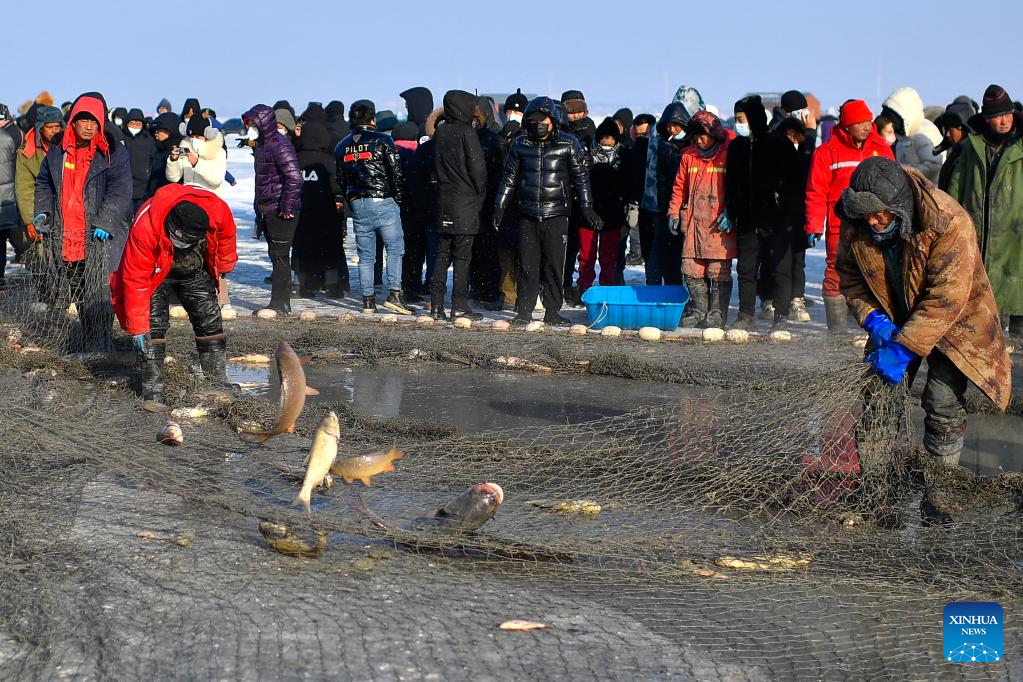 At dawn, workers at a fishery on Chagan Lake in Qian Gorlos Mongolian Autonomous County, Songyuan city, northeast China's Jilin Province, haul part of a fishing net from under the ice, watching plump fish jump out of the hole they dug there the previous night.