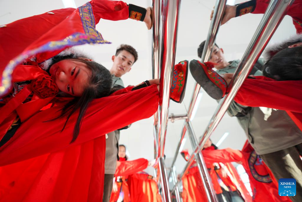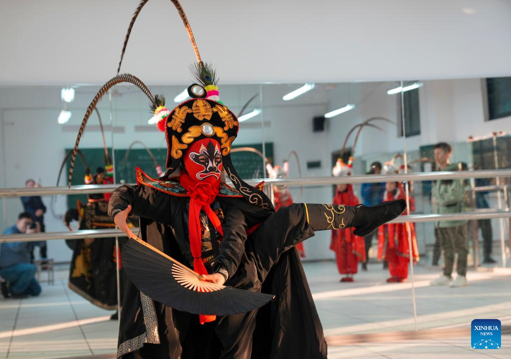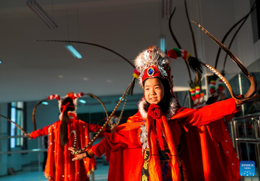 A student practices the traditional "bian lian", or face-changing skills, in a dance classroom at Wu'an primary school in Dianjiang County, southwest China's Chongqing, Nov. 28, 2023. With more than 600 students, Wu'an primary school in recent years cooperated with folk artist Li Yong and added face-changing as a special part to its curriculum. The face-changing technique is one of the most famous parts of Sichuan Opera, whereby actors rapidly alter their face makeup in stunning and dramatic effect. (Xinhua/Liu Chan)