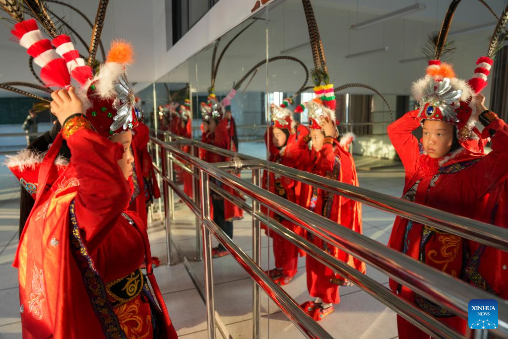 Students prepare to practice the traditional "bian lian", or face-changing skills, in a dance classroom at Wu'an primary school in Dianjiang County, southwest China's Chongqing, Nov. 28, 2023. With more than 600 students, Wu'an primary school in recent years cooperated with folk artist Li Yong and added face-changing as a special part to its curriculum. The face-changing technique is one of the most famous parts of Sichuan Opera, whereby actors rapidly alter their face makeup in stunning and dramatic effect. (Xinhua/Liu Chan)