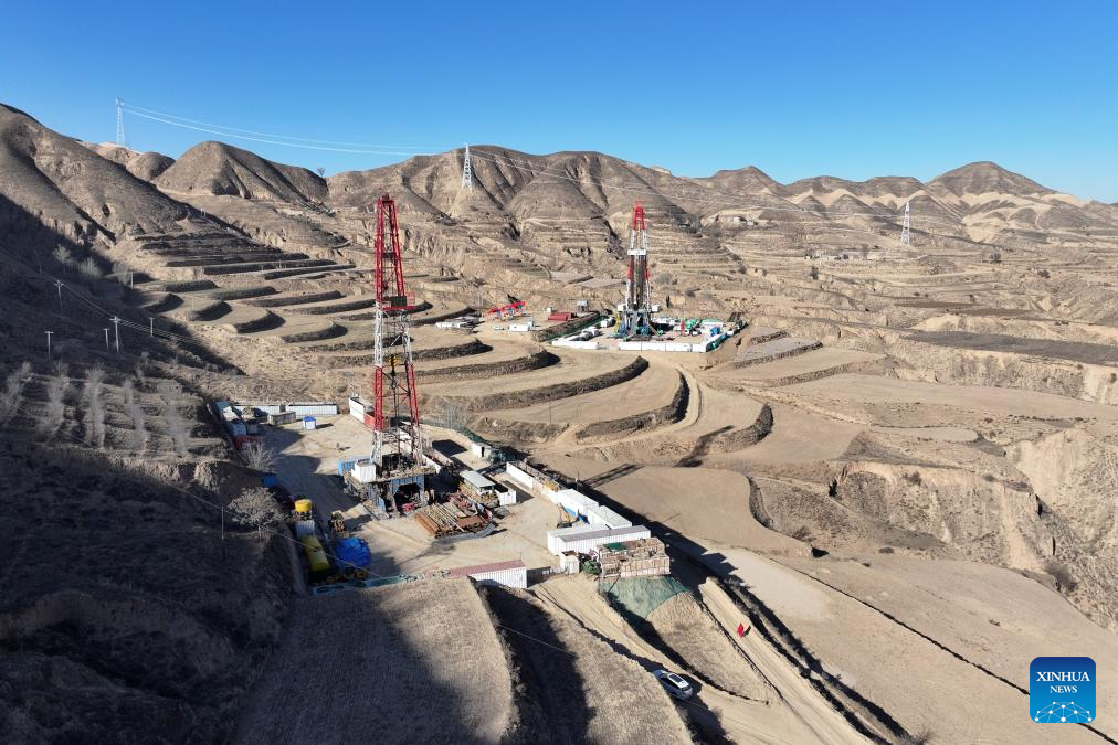 This aerial photo taken on Nov. 30, 2023 shows a drilling site of Hongde oilfield in Huanxian County of northwest China's Gansu Province. Changqing Oilfield, a branch of PetroChina, has discovered a large-scale, well-preserved oilfield with geological reserves of over 100 million tonnes in the county. (Changqing Oilfield/Handout via Xinhua)