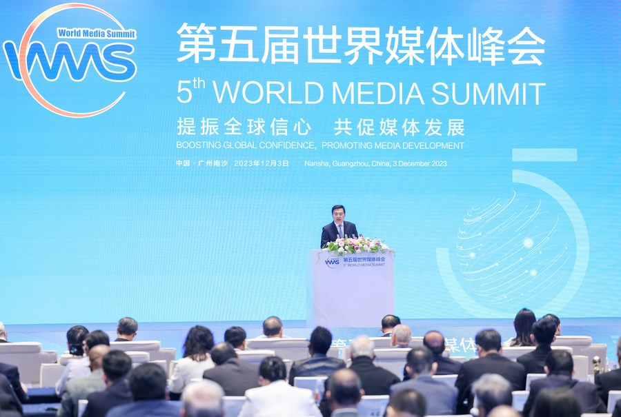 Fu Hua, executive chairman of the World Media Summit and president of Xinhua News Agency, addresses the opening ceremony of the 5th World Media Summit in Guangzhou, capital of south China's Guangdong Province, Dec. 3, 2023. (Xinhua/Liu Bin)