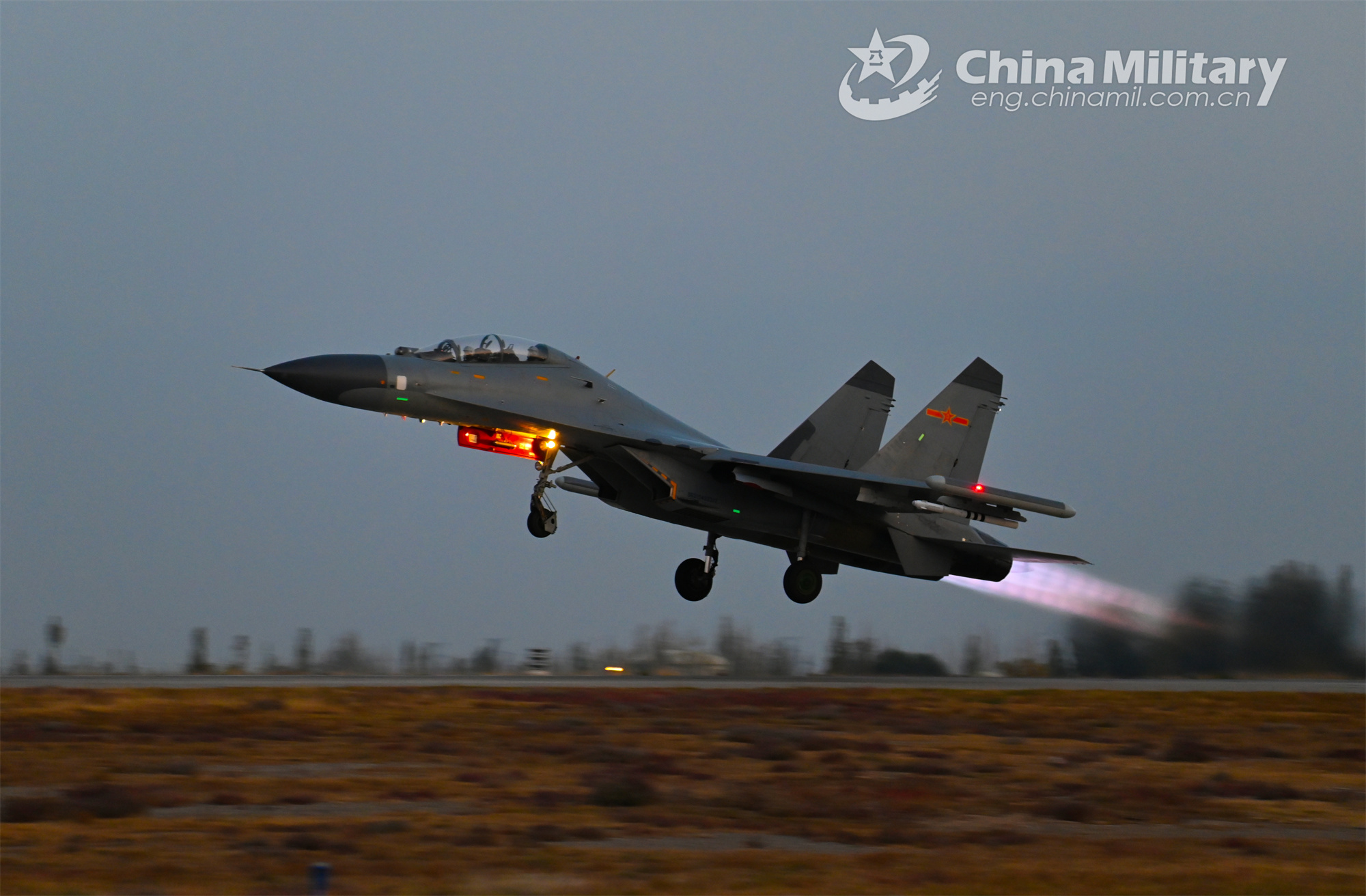 A fighter jet attached to an aviation brigade of the air force under the PLA Western Theater Command takes off for a round-the-clock flight training exercise on November 26, 2023. (eng.chinamil.com.cn/Photo by Yu Zeqi)