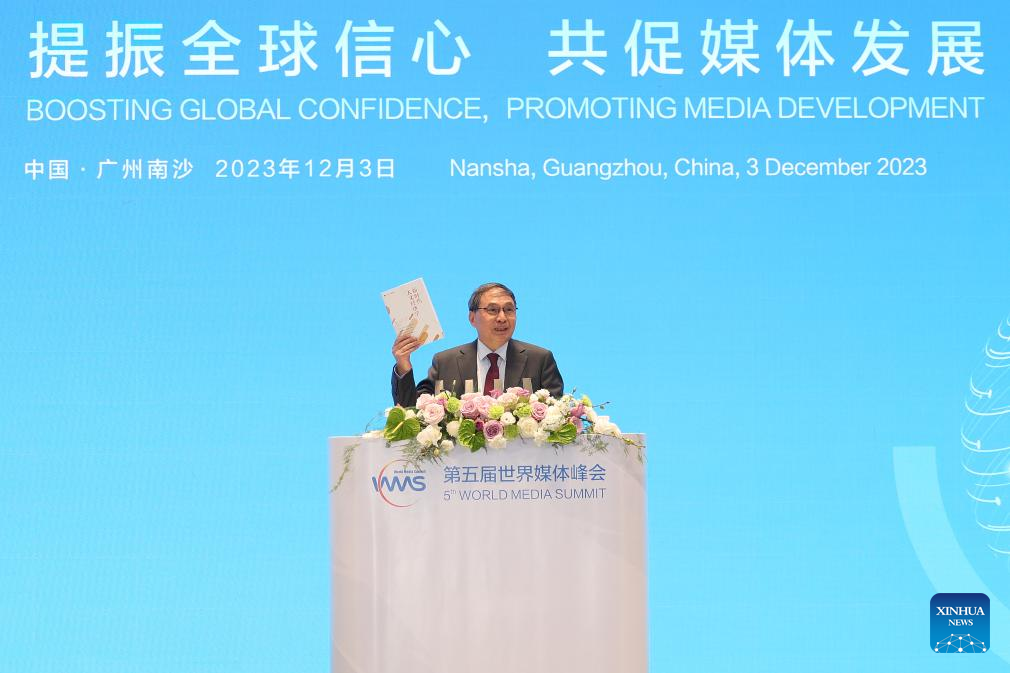 Fu Hua, president of Xinhua News Agency and chairman of the academic committee of New China Research (NCR), addresses the launch ceremony of a research report titled "The Humanomics in the New Era" during the ongoing 5th World Media Summit (WMS) in Guangzhou, capital of south China's Guangdong Province, Dec. 3, 2023. (Xinhua/Liu Bin)