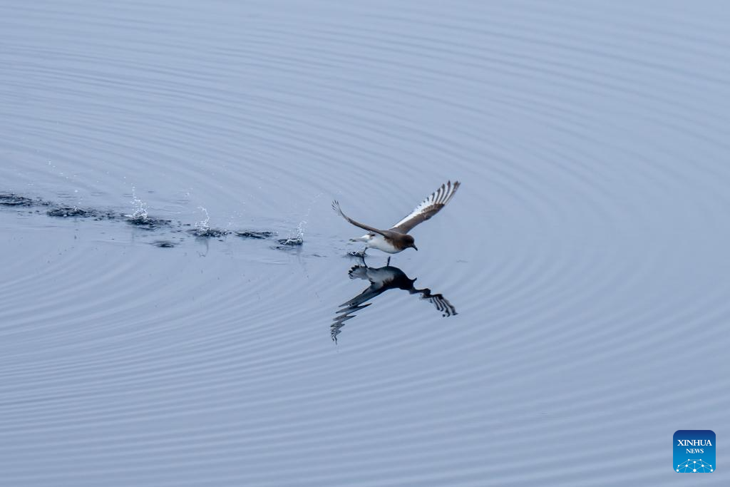 A bird is pictured near China's research icebreaker Xuelong 2, Dec. 3, 2023. China's research icebreaker Xuelong 2 and its companion cargo vessel Tian Hui are now sailing through ice floes. (Photo by Li Jingshi/Xinhua)