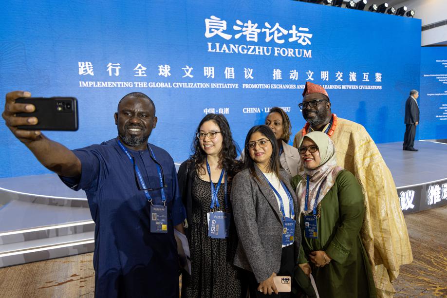 Participants in the first Liangzhu Forum take a selfie on Sunday in Hangzhou, Zhejiang province. Themed "Implementing the Global Civilization Initiative, Promoting Exchanges and Mutual Learning Between Civilizations", the forum was attended by over 300 guests from China and abroad. LI ZHENYU/FOR CHINA DAILY