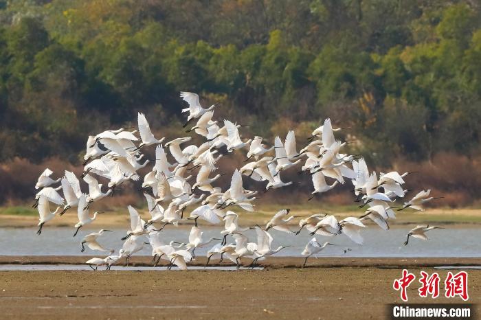 Photo taken on Nov. 24, 2023 shows Eurasian spoonbills flying over Poyang Lake in Hukou county, east China's Jiangxi Province. (Photo/Zhang Yu)