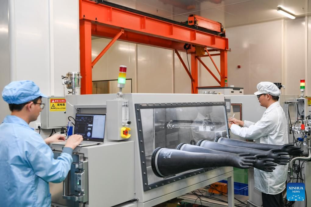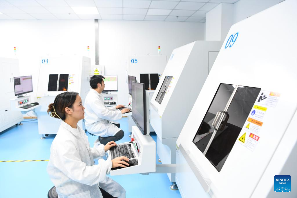 Workers are seen at a testing workshop of a technology company at a sensor industrial park in Chongqing, southwest China, Nov. 30, 2023. In recent years, the Beibei District of Chongqing has worked together with China Railway Construction Corporation Limited (CRCC) in building a sensor industrial park. By introducing preferential policies, support funds and investment, the park is aimed at promoting the intelligent sensor industry to develop in a large-scale, specialized, differential and high-end way. (Xinhua/Wang Quanchao)