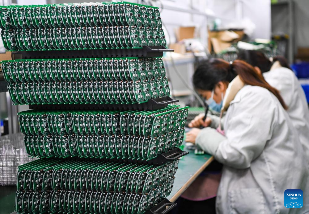 Workers are seen at a production workshop of a smart technology company at a sensor industrial park in Chongqing, southwest China, Nov. 30, 2023. In recent years, the Beibei District of Chongqing has worked together with China Railway Construction Corporation Limited (CRCC) in building a sensor industrial park. By introducing preferential policies, support funds and investment, the park is aimed at promoting the intelligent sensor industry to develop in a large-scale, specialized, differential and high-end way. (Xinhua/Wang Quanchao)